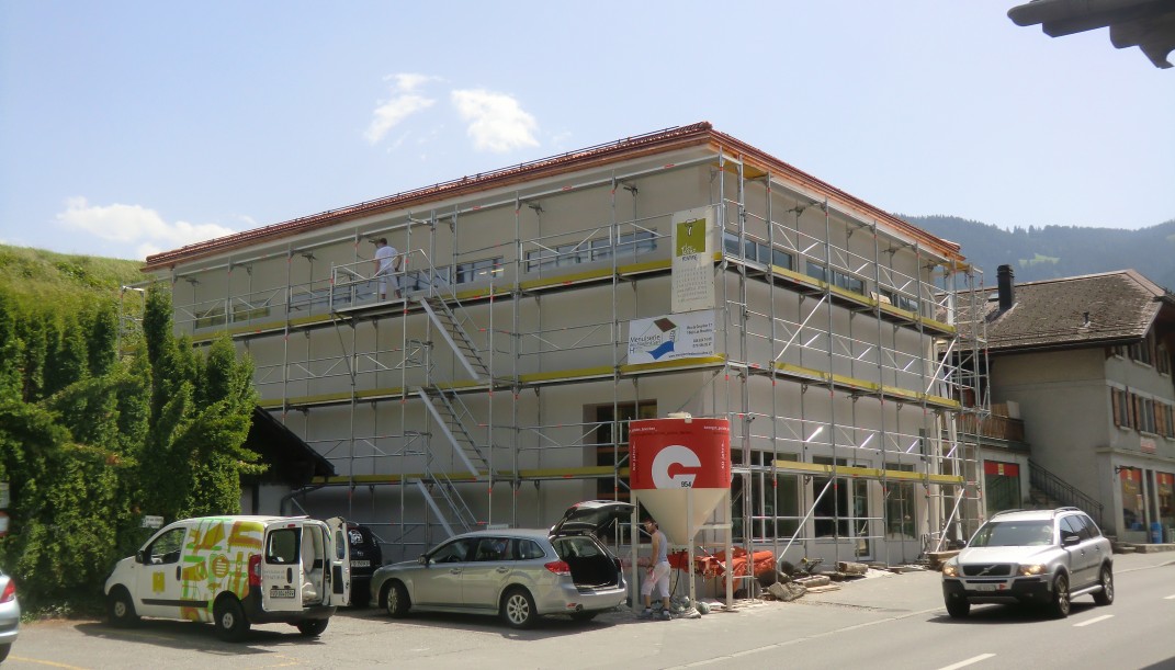 Isolation périphérique de tout le bâtiment avec peinture décorative des façades principales côté route.